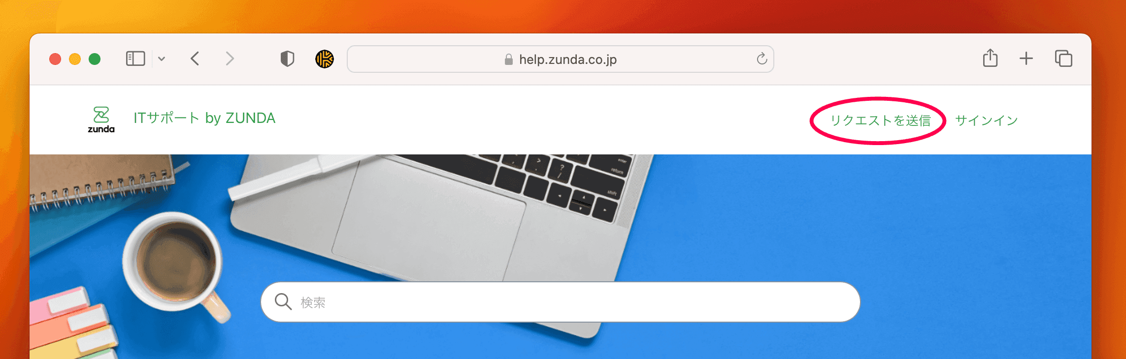 ITサポート右上の「リクエストを送信」をクリックし、画面の案内に沿ってメールアドレスを入力してログインしてください。初回利用時は会社やご利用者についてお伺いする場合があります。